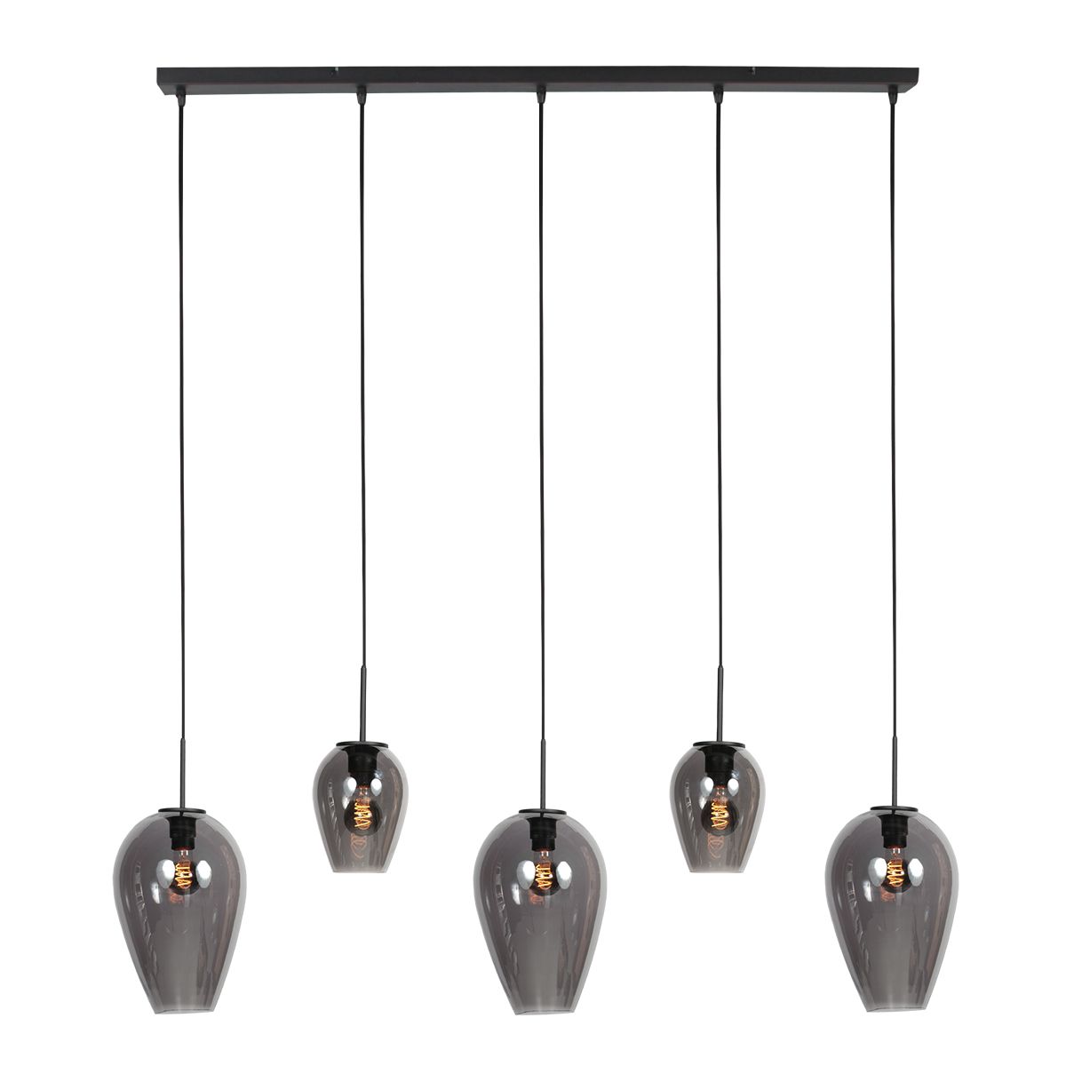 De lamp is uitgerust met 5 E27 fittingen, elk bevestigd aan een stevig strijkijzersnoer met een maximale lengte van 150 cm. Hierdoor kun je de lichtpunten op verschillende hoogtes hangen en zo spelen met ritme en ruimte. Ideaal voor een moderne of industriële inrichting.